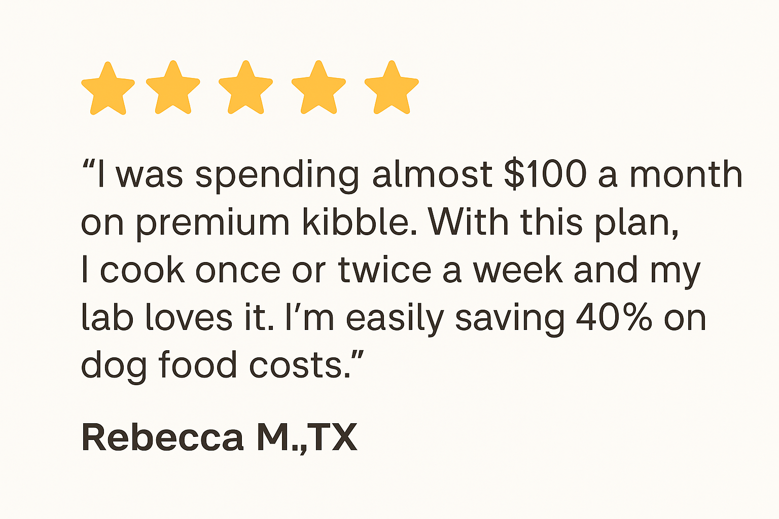 I was spending almost $100 a month on premium kibble. With this plan, I cook once or twice a week and my lab loves it. I’m easily saving 40% on dog food costs.